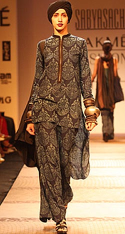 Other designers use khadi too, but Sabyasachi has been the most successful in selling it, thanks partly to his insatiable Marwari clientele, which makes sure his clothes are sold out two hours after they are put out on retail shelves. He tries to wear this fondness for khadi lightly, insisting it is not a patriot’s agenda, but he doesn’t really succeed. Usually cynical, bored with the ‘intellectual’ tag the media has thrust on him and always restive, he becomes unapologetically eloquent if you so much as mention Indian weaves, the sari or Fabindia. He does a hardsell of Gandhian simplicity. Only, like Gandhi’s goat milk, which had to be acquired with effort and money, the Sabyasachi brand of simplicity is expensive. A khadi sari created by him can set you back by a lakh of rupees. He is now charmed with the idea of refashioning Bollywood besides curating affordable cotton saris from the remotest parts of the country to influence the way India dresses. Here, he tells