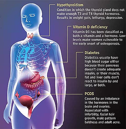 “Out of every 10 women walking into our centres, seven have some hormonal imbalance or the other,” says Dr Shilpa Morekar, consultant pathologist at NM Medical, which provides diagnostic services to endocrinologists, gynaecologists and infertility specialists in the country via five branches in Mumbai and one in Bangalore. Ruling the roost of endocrinal disorders are diabetes, PCOs, hypothyroidism and low levels of Vitamin D3 (now classified as a hormone).