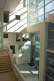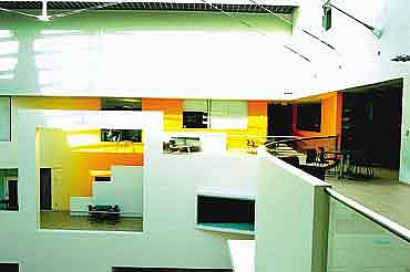 Towering above this high glass roof are vents that ensure the circulation of fresh air. Agreeing that the vents make for an industrial look, Correa says, "They are part of a factory we call MIT." Colour-coded corridors in shades of red, orange and blue connect the three different centres housed in the building, enabling occupants to easily find their way.