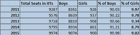 In 2015, 9,974 students got admission in 18 IITs, out of which only 900 were girls. The gender disparity is also a prevalent phenomenon in AICTE-approved technical institutions. The percentage of girls who secured admissions in AICTE-approved technical institutions during the academic years 2014-15 and 2015-16 stood at 42.21 and 46.60 per cent respectively, while in IITs it was just 8 per cent in 2015-16. Among all IITs, Indian Institute of Technology, Gandhinagar had a record intake of 16 girls in a batch of 136 students i.e. 11% in its 2015-16 batch. On an average, the ratio of male to female students on an IIT campus is 10:1