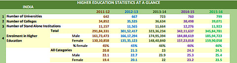 The gender gap is slowly getting narrowed in higher education. The percentage of girl enrollment in higher education is gradually rising from 39% in 2007 to 46% in 2014. However, the same trend is not seen in IIT admissions.