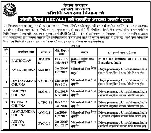 In a public notice, Nepal's Drug Administration has asked Baba Ramdev's Patanjali Ayurveda to recall six 'substandard products' with immediate effect.