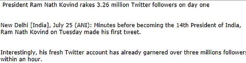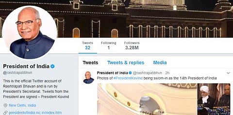 President of India Ramnath Kovind’s official twitter handle inherited over 3 million followers of former president Pranab Mukherjee, and didn’t gain them in an hour of swearing-in as some news websites said.