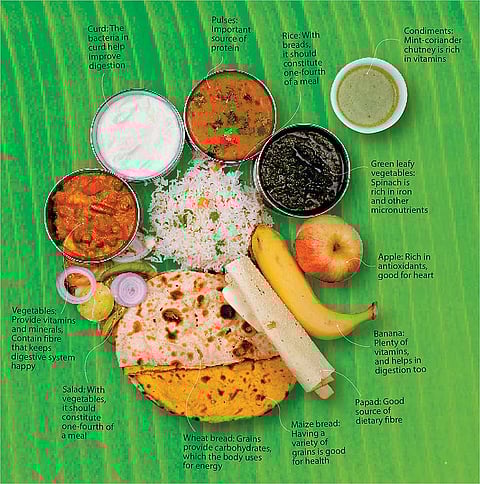 The solution is simple. A broad, assorted diet that includes foods from possibly all these 12 food groups: 1) cereals and millets, 2) pulses and legumes, 3) green leafy vegetables, 4) other vegetables, 5) roots and tubers, 6) nuts and oil seeds, 7) condiments and spices, 8) fruits, 9) fish and other meats, 10) milk and milk products, 11) fats and oils, 12) sugar and jaggery. A rounded diet is one with balanced proportions of at least nine of the 12 food groups.