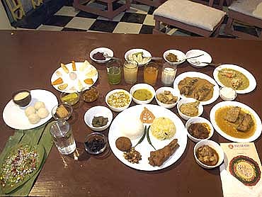 he first challenge before the organisers was to recreate the Thakurbari (Tagore mansion) ambience, but since their first choice, Shantiniketan or the ancestral Tagore home in Jorasanko, was not available, they finally zeroed in on the Shovabazar Rajbari, a decaying royal palace in the by-lanes of north Calcutta. For seven days, from June 4-10, its outer courtyard was converted into the dining space of the Tagore household. The Tagores had adopted an interesting east-west fusion, making their table and chairs higher than the traditional chowki-piri but lower than the conventional dining table and chairs, so that one could either eat sitting cross-legged or in the western way. This look was meticulously recreated for the food festival. The crockery was fine porcelain, of the kind the Tagores adopted after their trips abroad, and food was served by men and women dressed in elegant "dhuti-panjabi" and cream saris bordered in red, with the household keys dangling from the pallu, in the manner of the Tagore ladies.