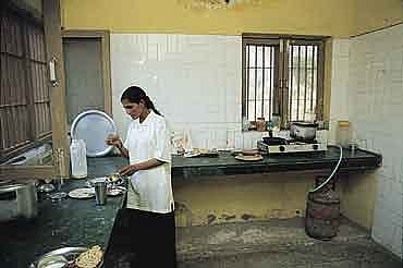 No evenings out, or chilling out in front of the television, cooking and eating alone in the mess(above), it's a gruelling life. But Rajesh has learnt to thrive on it, and likes it best when she's with room-mate Sarita (below)or laughing with friends."So much so I've stopped missing my parents.' she says.