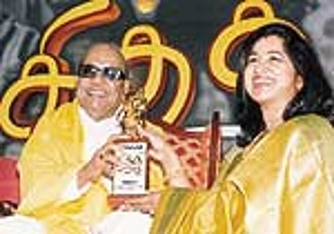 Radhika, whose papa M.R. Radha was a staunch dmkite, not only aired Chitti onthe unofficial dmk channel, sun tv, but even incorporated some crucial events of recenthistory. In one of the concluding episodes, one saw protagonist Sarada being arrested inthe middle of the night and roughed up quite like the former chief minister was on thenight of June 29. (Wonder if Jayalalitha was watching...) No wonder Mu.Ka.(as the dmkchief is known) was the ‘appropriate’ chief guest, and he said: "I havecome to honour my daughter." And Radhika, whose husband Sarath Kumar was recentlymade Rajya Sabha MP by the dmk, is ready with her next package: Kaveri, sametime, same slot, beginning immediately after Chitti ends on November 10. Set inMumbai, it stars Madhoo (of Roja fame).