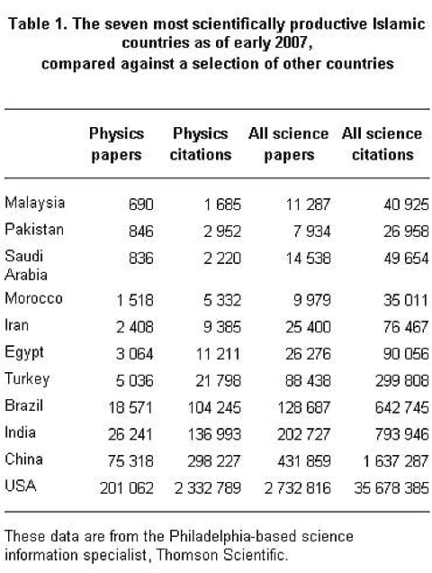 The question I want to pose--perhaps as much to myself as to anyone else--is this: With well over a billion Muslims and extensive material resources, why is the Islamic world disengaged from science and the process of creating new knowledge? To be definite, I am here using the 57 countries of the Organization of the Islamic Conference (OIC) as a proxy for the Islamic world.