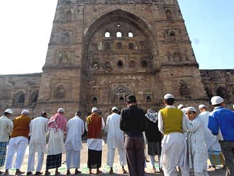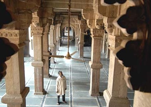 Throughout two centuries of high politics and war, the heart of Jaunpur remained intact and imposing. The Shahi Fort, built by Firozshah Tughlaq in 1360, still commands the highest point in the city, its bulbous ramparts overlooking the shining Gomti river and the 14-metre high gateway frowning down on a city that no longer heeds it. Inside, the walls enclose a pretty park of hospitable lawns and flowering shrubs, discreetly populated, like all urban parks, by lovers and snoozers. In the forecourt of it is a small but beautiful prayer hall, with a twelve-metre commemorative pillar before it. A.K. Sinha, the asi’s local conservation assistant, says an inscription on the column declares the fort a place for "Hindus to read the Gita and Muslims to read the Koran and Christians to read the Bible".