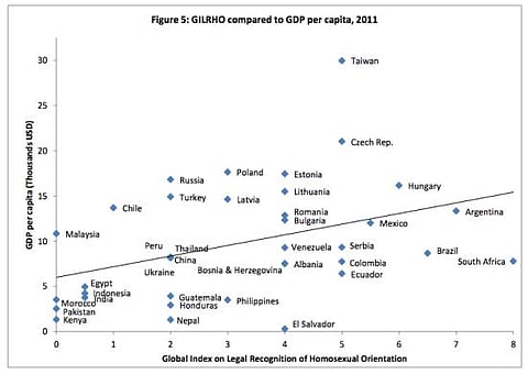 It isn't easy prove which way the link works — does more equality lead to better economic output or are richer countries more open to diverse lifestyles? But the research does show that when LBGT people experience discrimination and violence, their ability to contribute to the economy is diminished. Aggregating this to the whole economy, it is easy to see how exclusion reduces net economic output. A World Bank study estimated that our homophobia is costing us between $2 to $30 billion.
