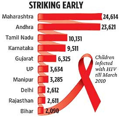 Maharashtra, at 24,614, has the highest number of HIV-infected children, followed by Andhra Pradesh at 23,621. Arunachal Pradesh, Sikkim and Tripura, as is to be expected in small or sparsely populated states, have the fewest—six cases each. The government figure for children with the virus detected during the period 2002-03 to March 2010 is 1.01 lakh but UNICEF pegs it higher, at 2.2 lakh.