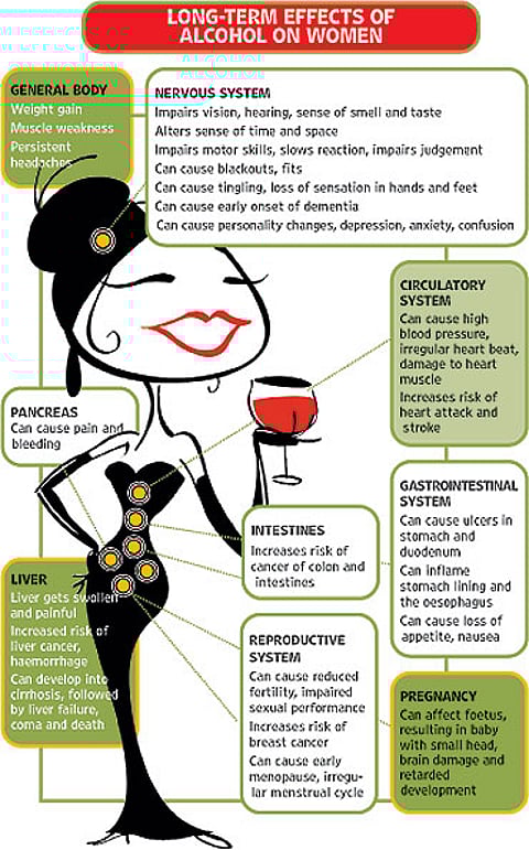 The longer-term impacts are frightening: tissue, brain and liver damage. "One thing is beyond debate," says Dr Vivek Benegal, the deaddiction specialist behind the NIMHANS study. "And that’s something women need to be aware about. They run a higher risk of developing alcohol-related problems with smaller doses of alcohol, and in a shorter drinking career."