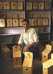 Bird estate agent: Birdman Mohammed Dilawar with his wooden nesting boxes |