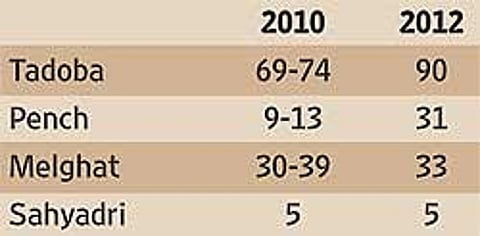 Once you sign up for a tiger safari, your fervent prayer is that the rare big cat obliges with a darshan. And if you are in Maharashtra, your chances just got a little brighter. A tiger count conducted in 2012 in four reserves in the state shows an addition of nearly 40 tigers in less than two years, says an internal report. The tiger census, using the camera trapping method, was conducted in the Tadoba, Pench, Melghat and Sahyadri tiger reserves. The figure does not include tigers from other reserves such as Nagzira, Navegao and parts of Gadchiroli.