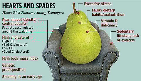 At the risk of sounding alarmist, the fact is that a sizable number of children in their teens are now showing signs of being at heart risk. Studies conducted in the past year in several cities across the country suggest that more and more factors like poor lifestyle choices, smoking at an early age, vitamin D deficiency, diabetes etc are putting teenagers at risk. Dr Dev B. Pahlajani, cardiologist at Breach Candy Hospital, Mumbai, explains, “To most teenagers a heart risk comes as a shock because the assumption is that this is a disease for the later stages of life. They never get cholesterol levels checked and generally come with complaints of breathlessness. Teenagers also assume that symptoms like gas, acidity after drinking alcohol are not heart-related and therefore do not take them to be fatal. But these need to be reported.”