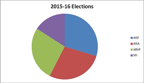 In 2016 elections, the Left Unity — AISA and SFI — came into being. The objective was one- to keep the saffron forces out and reinstate the Left identity. The AISF, however, has never been a part of any such alliance and always fought the elections alone since 2013 -- the year they stepped into electoral politics in the campus.
