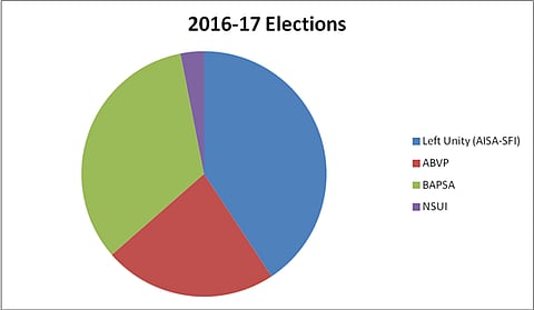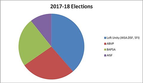 When we look at the vote shares of this year’s election (2017-18), we observe that the trend has remained the same. In order to get a consolidated mandate to the Left Unity, another break-away faction -- the Democratic Students’ Federation (DSF) -- had too joined the coalition.