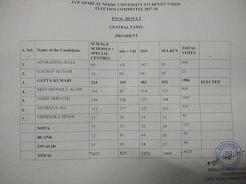 While Left Unity’s Geeta Kumari won the seat with 1506 votes, ABVP’s Nidhi Tripathi managed to put up a fairly decent fight at the second position with a total of 1042 votes.