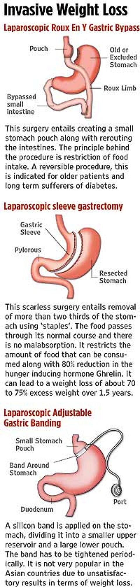 It’s only been seven years since the first Indian patients went under the knife. “Bariatric surgery is still an experimental procedure. The long-term effects—after 10 years—are not known. It is one of the options to treat diabetes and should be tried only after medication, diet and exercise have failed in the morbidly obese,” says endrocrinologist Dr Shashank Joshi. He says eating right and regular exercise have better long-term impacts than surgery. In an age of “evidence-based” medicine, Dr Joshi points out, the long-term effects of bariatric surgery have not really been studied rigorously, even though the short-term effects—within six months to two years—seem promising. “It is an emerging option and we need to do studies that follow up on patients. I have seen patients regaining weight in two to three years,” he argues.