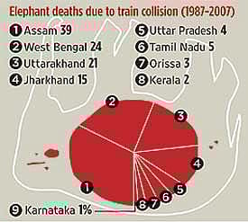 Anish Bose, secretary of the Himalayan Nature and Adventure Foundation, says: “While it took seven elephants to die on a single railway track on one single night to grab the headlines, death of animals on the tracks is a regular occurrence here.” According to the most recent census report of the state forest department, 26 elephants have been killed between 2004 and 2008, all hit while either crossing the tracks that run through the forests or while resting on the tracks, unaware of approaching trains.