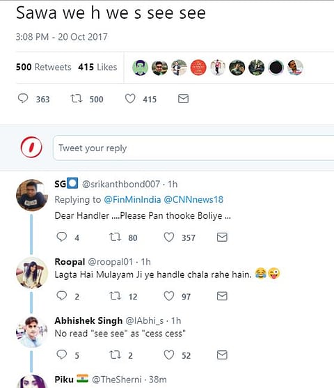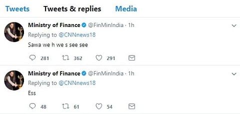 The Finance Ministry's Twitter handle replied to a News18 article posted on October 18 titled 'One apprehended in Delhi for selling crackers to people secretly'. It chose to reply to the handle with two tweets. One read "Sawa we h we s see see" and the other said "Ess".