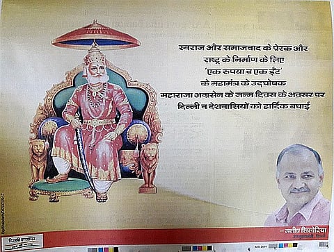 A half-page advertisement in newspapers released by Delhi Government greeted people on the birth anniversary of Maharaja Agrasen. The advertisement raised eyebrows for two reasons. One, it had the photograph of the Deputy Chief Minister Manish Sisodia and not of the chief minister ( Indeed in The Indian Express Sisodia's photograph appeared in three advertisements and on two consecutive pages). It triggered speculation whether the obviously deliberate and conspicuous omission of Arvind Kejriwal in the advertisements carried any political significance.