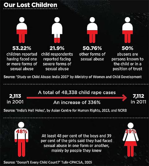 But these are children who have been lucky to get support from the government and the public. Most others have no such recourse. They remain numbers, anonymous entries in our statistical record books. Here’s a fact from the National Crime Records Bureau—between 2001 and 2011, there’s been a three-fold jump in registered child rape cases, from 2,113 in 2001 to 7,112 instances 10 years later. Many more aren’t even recorded as numbers.