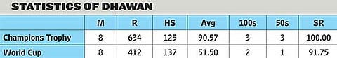 It’s curious how, by a fortuitous accretion of good results, every cricketer tends to have a favourite venue. For example, Anil Kumble and Delhi’s Ferozeshah Kotla, where he took all 10 wickets in a Test innings in 1999, or Mohammed Azharuddin and the Eden Gardens, where he has five Test centuries, or Sunil Gavaskar and the Queen’s Park Oval, in Port of Spain (four centuries). For Shikhar Dhawan, it is Kennington Oval in London, where he averages an astounding 152.50, and Edgbaston in Birmingham, where he has regained his form in this year’s Champions Trophy. Dhawan, 31, relishes scoring on foreign soil—his other 200-plus run aggregates in 79 ODIs are at the Melbourne Cricket Ground and the Sher-e-Bangla National Stadium in Dhaka.