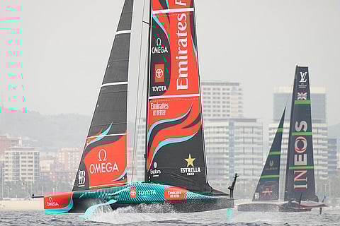 Ineos Britannia and Emirates Team New Zealand warm-up for the Louis Vuitton 37th America's Cup Day 3 race 4 in Barcelona, Spain.