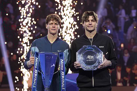 Italy's Jannik Sinner, the winner, and runner-up Taylor Fritz of the United States pose after the ATP World Tour Finals final match at the Inalpi Arena, in Turin, Italy.