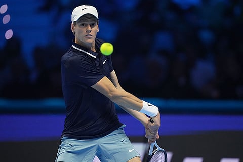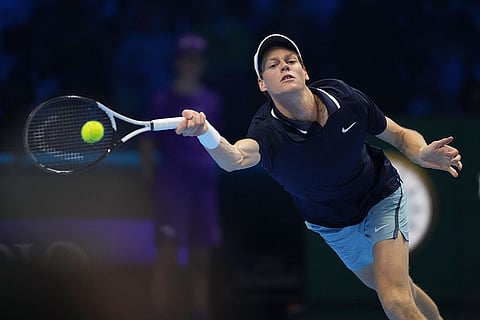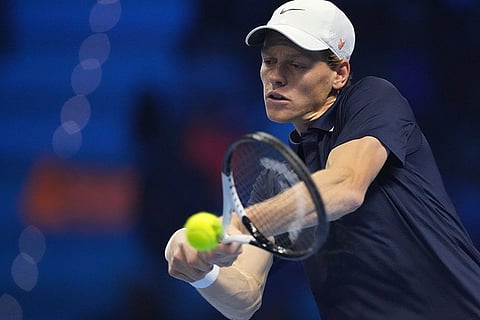 Italy's Jannik Sinner returns to Taylor Fritz of the United States during the final match of the ATP World Tour Finals at the Inalpi Arena, in Turin, Italy.