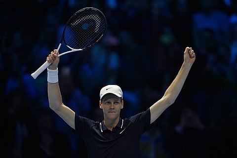 Italy's Jannik Sinner celebrates after winning the final match of the ATP World Tour Finals against Taylor Fritz of the United States at the Inalpi Arena, in Turin, Italy.