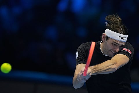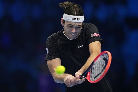 Taylor Fritz of the United States returns to Italy's Jannik Sinner during the final match of the ATP World Tour Finals at the Inalpi Arena, in Turin, Italy.