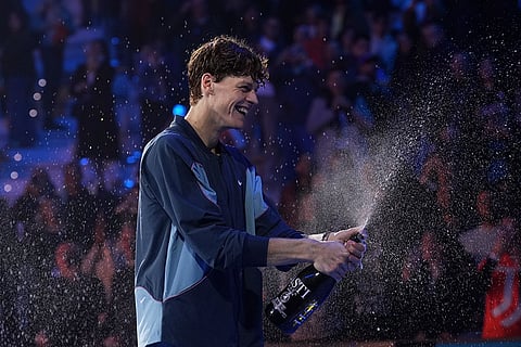 Italy's Jannik Sinner poses after winning the final match of the ATP World Tour Finals against Taylor Fritz of the United States at the Inalpi Arena, in Turin, Italy.