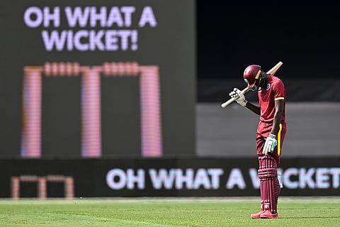 Matthew Forde of the West Indies falls as he is run out during the third one day international between Australia and the West Indies at the Manuka Oval in Canberra, Australia.