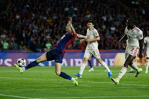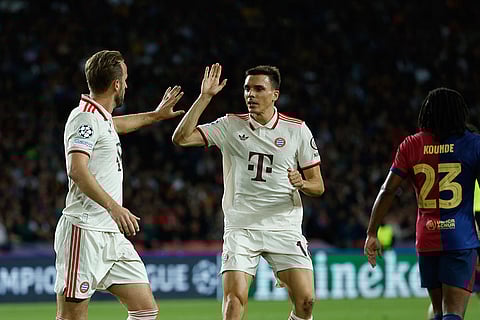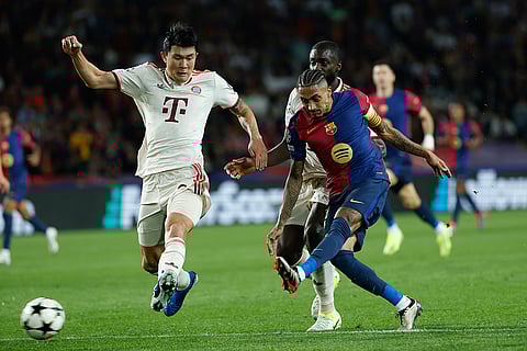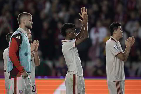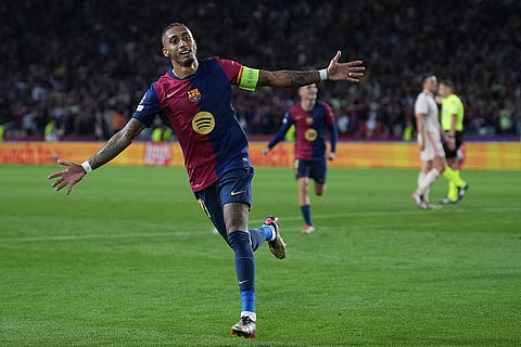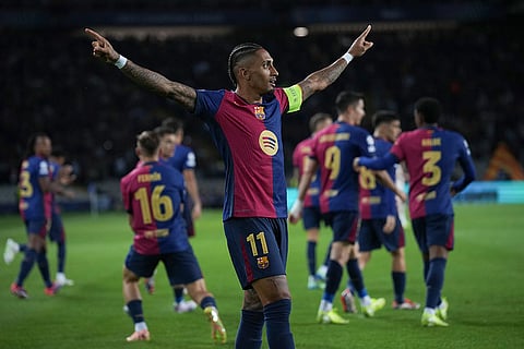 Barcelona's Raphinha, left, after a hat-trick celebrates with teammates his team's win after the end of a Champions League opening phase soccer match between Barcelona and Bayern Munich at the Lluis Companys Olympic Stadium in Barcelona, Spain. Barcelona won 4-1.