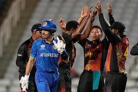 Afghanistan's batsman Rahmanullah Gurbaz leaves the field bowled by Papua New Guinea's blower Alei Nao, back second from right, during an ICC Men's T20 World Cup cricket match at Brian Lara Cricket Academy in Tarouba, Trinidad and Tobago.