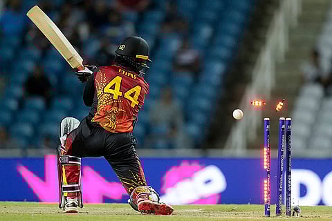 Papua New Guinea's Hiri Hiri is bowled out by Afghanistan's Naveen-ul-Haq during an ICC Men's T20 World Cup cricket match at Brian Lara Cricket Academy in Tarouba, Trinidad and Tobago.