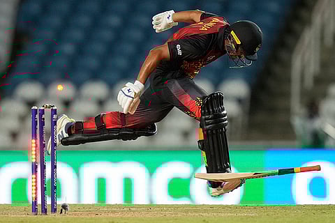 Papua New Guinea's Norman Vanua is run out during an ICC Men's T20 World Cup cricket match against Afghanistan at Brian Lara Cricket Academy in Tarouba, Trinidad and Tobago.