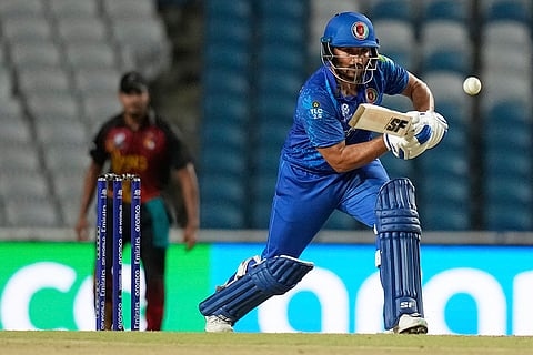 Afghanistan's Gulbadin Naib bats against Papua New Guinea's during an ICC Men's T20 World Cup cricket match at Brian Lara Cricket Academy in Tarouba, Trinidad and Tobago.