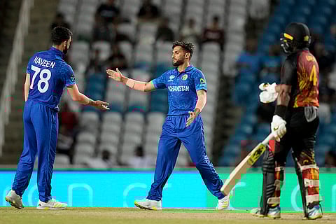 Afghanistan's bowler Naveen-ul-Haq celebrates taking the wicket of Papua New Guinea's Tony Ura, right, during an ICC Men's T20 World Cup cricket match at Brian Lara Cricket Academy in Tarouba, Trinidad and Tobago.