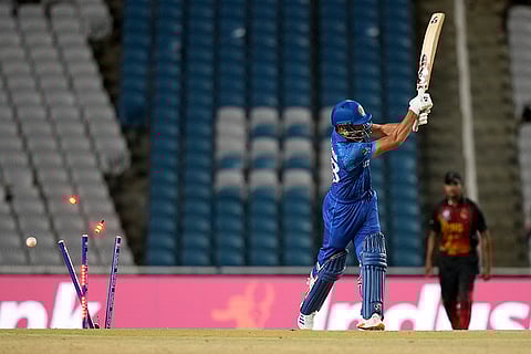 Afghanistan's Ibrahim Zadran is bowled by Papua New Guinea's Sema Kamea during an ICC Men's T20 World Cup cricket match at Brian Lara Cricket Academy in Tarouba, Trinidad and Tobago.