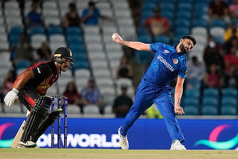 Afghanistan's Naveen-ul-Haq bowls against Papua New Guinea during an ICC Men's T20 World Cup cricket match at Brian Lara Cricket Academy in Tarouba, Trinidad and Tobago.