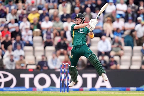 South Africa's Dewald Brevis hits a six while batting during the third ODI series cricket match between England and South Africa, at Utilita Bowl, Southampton, England.