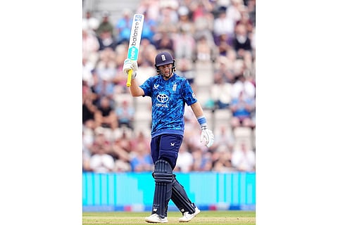 England's Joe Root celebrates hitting a half century during the third ODI series cricket match between England and South Africa, at Utilita Bowl, Southampton, England.