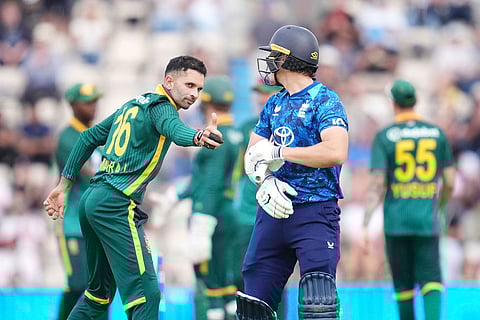 England's Jacob Bethell, front, leaves the field after being bowled out by South Africa's Keshav Maharaj, left, during the third ODI series cricket match between England and South Africa, at Utilita Bowl, Southampton, England.