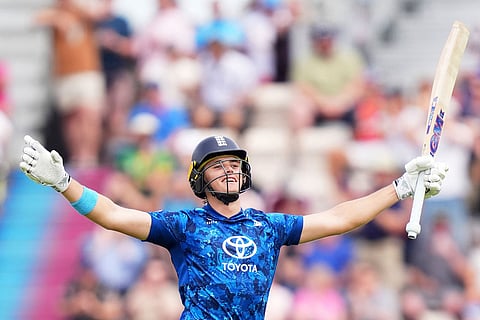 England's Jacob Bethell celebrates hitting a century during the third ODI series cricket match between England and South Africa, at Utilita Bowl, Southampton, England.