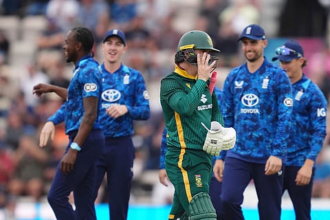 South Africa's Matthew Breetzke, front, leaves the field after England's Jofra Archer, rear left, took his wicketg during the third ODI series cricket match between England and South Africa, at Utilita Bowl, Southampton, England.