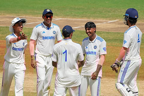 Indian players celebrate the wicket of Australia's batter Alex Lee Young during the third day of the 2nd Test cricket match between India U-19 and Australia U-19, at the M.A. Chidambaram Stadium, in Chennai.