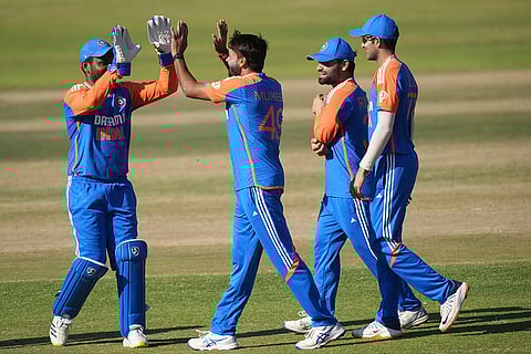 Indian players celebrate a wicket during the T20 cricket match between Zimbabwe and India at the Harare Sports club, in Harare.